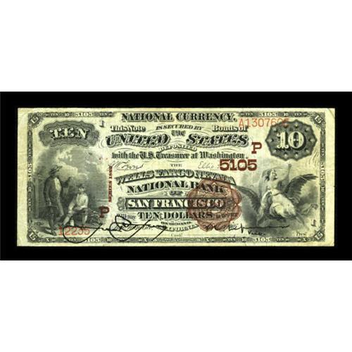 <B>San Francisco, CA</B></I> - $10 1882 Brown Back Fr. 490 <B>Wells-Fargo Nevada NB</B></I> Ch. # (P)5105<BR> The brown ink on the face is dark and the margins are more than ample. This $10 has printed signatures of both the cashier and the vice president. <B>Fine</B></I><BR><BR><b>Shipping:</b> Coins & Currency (<a target="_blank" href="http://www.heritageauctions.com/common/shipping.php">view shipping information</a>)