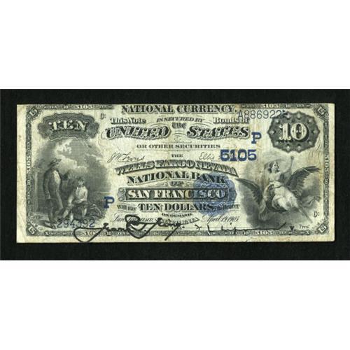 <B>San Francisco, CA</B></I> - $10 1882 Date Back Fr. 545 <B>Wells-Fargo Nevada NB</B></I> Ch. # 5105<BR> An example of a better type on this prolific issuer, the note is listed as VG in the census but actually is a nice <B>Fine </B></I>with the printed signatures still very bold.<BR><BR><b>Shipping:</b> Coins & Currency (<a target="_blank" href="http://www.heritageauctions.com/common/shipping.php">view shipping information</a>)