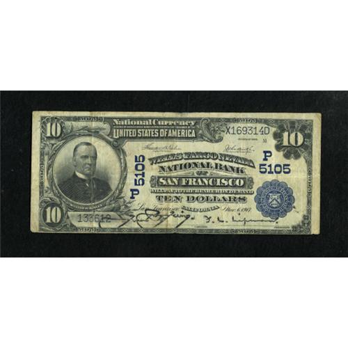 <B>San Francisco, CA</B></I> - $10 1902 Plain Back Fr. 632 <B>Wells-Fargo Nevada NB</B></I> Ch. # (P)5105<BR> A couple of minor holes are noted in the upper left corner and affect the eye appeal very little. <B>Fine.</B></I><BR><BR><b>Shipping:</b> Coins & Currency (<a target="_blank" href="http://www.heritageauctions.com/common/shipping.php">view shipping information</a>)