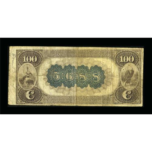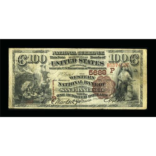 <B>San Francisco, CA</B></I> - $100 1882 Brown Back Fr. 530 <B>The Western NB</B></I> Ch. # (P)5688<BR> An extremely rare California type which is the only $100 Brown Back known from this institution. It's one of just nine reported from all banks in the state combined, and one of just seven that come with a serial number to back up the listing. We can find no record of this piece ever appearing at public sale, and, with the exception of the Horwedel collection example from Fresno, which sold for over $22,000 in 2004, can find no record of any $100 Brown Back from this state having been available at public sale for at least a decade. <B>Fine</B></I> or even a bit better, with a small notation on the back margin that affects nothing.<BR><BR><b>Shipping:</b> Coins & Currency (<a target="_blank" href="http://www.heritageauctions.com/common/shipping.php">view shipping information</a>)