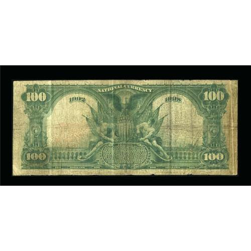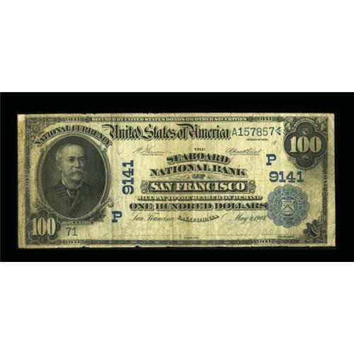 <B>San Francisco, CA</B></I> - $100 1902 Date Back Fr. 691 <B>The Seaboard NB</B></I> Ch. # (P)9141<BR> This short lived institution only issued 1902 Plain Backs in denominations of $5, $10, $20, $50, and $100. While a plethora of the $50's exist, this remains the only $100 to be enumerated in the census and was last seen at public auction over three years ago. The paper is decent, though there is some roughness about the edges to report. <B>Very Good-Fine.</B></I><BR><BR><b>Shipping:</b> Coins & Currency (<a target="_blank" href="http://www.heritageauctions.com/common/shipping.php">view shipping information</a>)