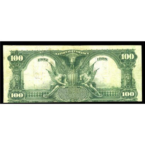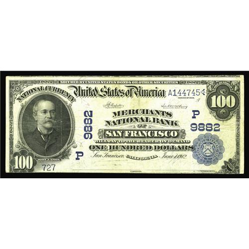 <B>San Francisco, CA</B></I> - $100 1902 Date Back Fr. 693 <B>Merchants NB</B></I> Ch. # (P)9882<BR>This crispy C-note comes from a bank that exited the banking stage on March 14, 1923. This is one of just seven Hundreds in the census for the Merchants with this <B>Fine</B></I> note showing even wear, hints of the signatures, and a bottom edge right below the bank officer titles. As types, $100 Date and Plain Backs combined are still scarcer than Deuces.