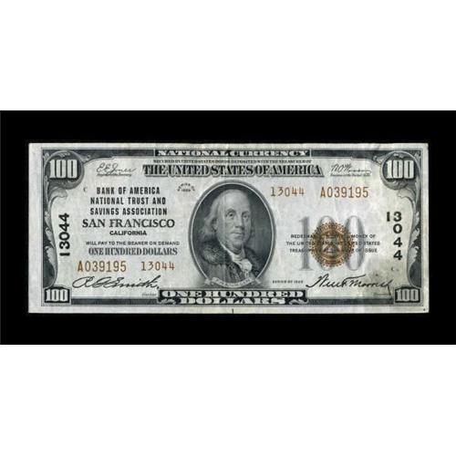 <B>San Francisco, CA</B></I> - $100 1929 Ty. 2 <B>Bank of America NT & SA</B></I> Ch. # 13044<BR> A barely circulated Type 2 hundred which is a new addition to the census for this very scarce type and denomination. <B>Extremely Fine+,</B></I> with a small counting mark at the bottom right corner the only detriment worthy of mention. <BR><BR><b>Shipping:</b> Coins & Currency (<a target="_blank" href="http://www.heritageauctions.com/common/shipping.php">view shipping information</a>)