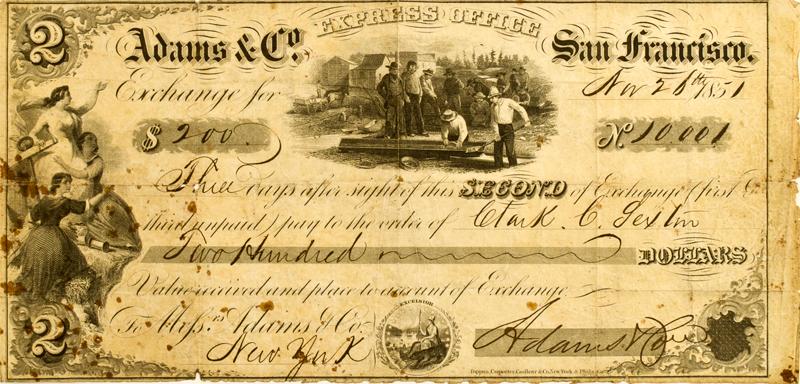 Second of Exchange written from the Adams & Co. Express Office, datelined San Francisco, November 26, 1851. No. 10001, payable after three days to Clark C. Gexton (?) for $200. Signed by Adams & Co., destined for the New York office. Vignettes include miners with sluice box at top center, three allegorical women at center left, and the Seal of California at bottom center. Printers: Toppan, Carpenter, Casilear & Co., New York & Philadelphia. No listing in Bancroft or Doggett's New York City Directory for Clark Jeston. Printed on white/oyster paper with several small holes, foldlines, and brown spots noted. Type II, Variety IIA.