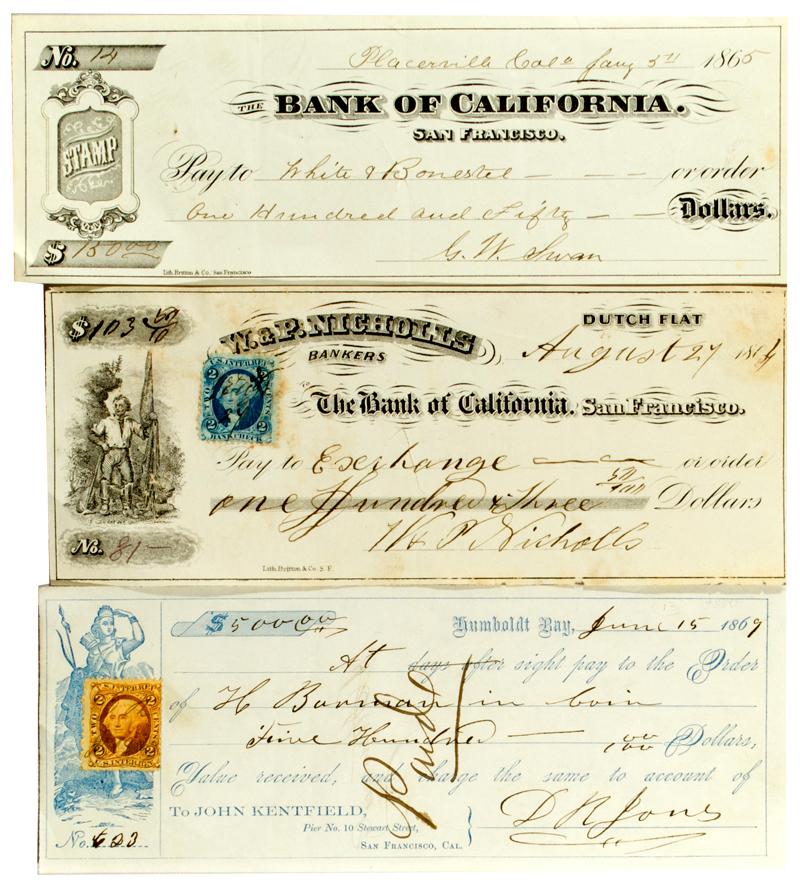 Lot of three. 1) No. 14 issued Jan. 5, 1865 to White and Bonestel for $150. Signed G.W. Swan. Endorsed on reverse. Drawn on Bank of California. Black on crème. 2) No. 81 issued Aug. 27, 1864 to Eserhange for $103. Signed W & P Nicholls. Issued on W & P Nicholls Bank check. Vignette of miner with pick and cloth at left. Black on crème One blue 2 cent manuscript cancelled revenue stamp at left. 3) No. 623 issued June 15, 1869 to H Bannan "in coin" for $500. Signed D.R. Jons. Issued on Humboldt Bay Bank payable to "John Kentfield." One orange 2 cent manuscript cancelled revenue stamp at left covering vignette. Endorsed on reverse. Blue on crème.