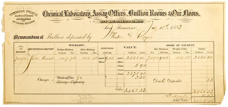 Memorandum of Gold Bullion Deposited by Wheeler & Rogers. Receipt for a gold ingot weighing 147.75 ounces .948 fine gold. Printed with black ink on white paper by Britton & Rey, San Francisco. There are chips along the upper left and lower right edges.