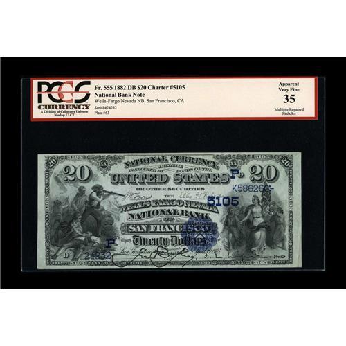 <B>San Francisco, CA</B></I> - $20 1882 Date Back Fr. 555 <B>Wells-Fargo Nevada NB</B></I> Ch. # (P)5105<BR>The note has a crisp appearance within the holder. Graded Apparent <B>Very Fine 35</B></I> by PCGS. Much of the note has given way to "Multiple Repaired Pinholes.</B></I> Regardless of the problems still a note with plenty of color and eye appeal.<BR><I>From The Collection of Daniel Weissman</B></I><BR><BR><b>Shipping:</b> Coin/Currency (<a target="_blank" href="http://www.heritageauctions.com/common/shipping.php">view shipping information</a>)