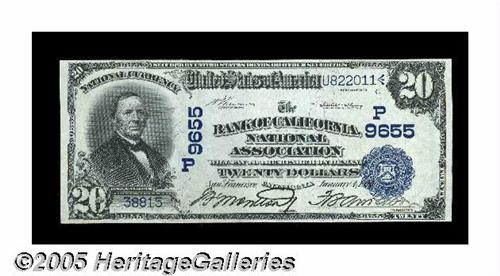 <B>San Francisco, CA</B></I> - $20 1902 Date Back Fr. 645 <B>The Bank of California NA</B></I> Ch. # (P)9655<BR>A lovely example of a type which is quite scarce in the highest grade ranges. <B>Choice Crisp Uncirculated,</B></I> ex-Harry Bass collection.