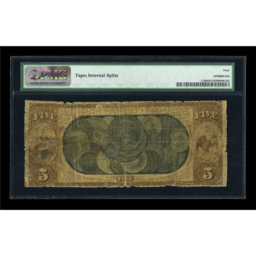 <B>San Francisco, CA</B></I> - $5 1870 Fr. 1136 <B>The First National Gold Bank</B></I> Ch. # 1741<BR> This example faces up well on both sides, however closer scrutiny reveals a repaired horizontal tear along the middle of the note at right and splits as mentioned on the PMG holder. A well-worn note that someone will be able to finally add to their type collection, albeit one that has been "rode hard". <B>PMG Good 04 Net.+</B></I><BR><BR><b>Shipping:</b> Coins & Currency (<a target="_blank" href="http://www.heritageauctions.com/common/shipping.php">view shipping information</a>)
