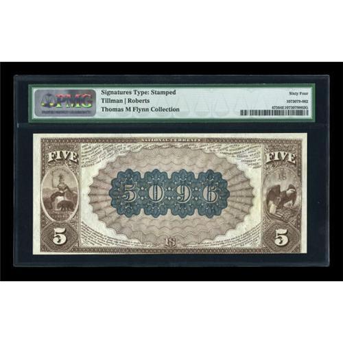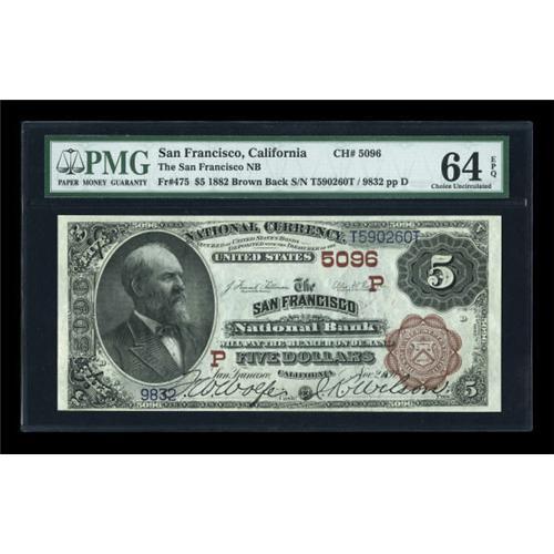 <B>San Francisco, CA</B></I> - $5 1882 Brown Back Fr. 475 <B>The San Francisco NB</B></I> Ch. # (P)5096<BR> An attractive example of the only easily obtained Brown Back from California in this state of preservation. PMG has designated this example <B>Choice Uncirculated 64 EPQ,</B></I> noting the exceptional paper quality found on this piece.<BR><I>From The Thomas M. Flynn Collection</B></I><BR><BR><b>Shipping:</b> Coins & Currency (<a target="_blank" href="http://www.heritageauctions.com/common/shipping.php">view shipping information</a>)