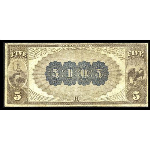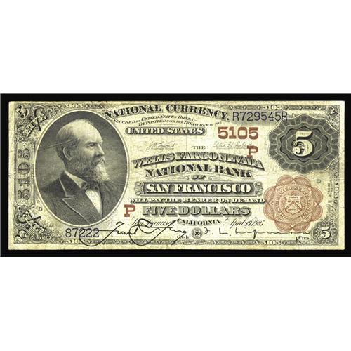 <B>San Francisco, CA</B></I> - $5 1882 Brown Back Fr. 477 <B>Wells-Fargo Nevada NB</B></I> Ch. # (P)5105<BR>A <B>Fine</B></I> type National from a bank which issued Brown Backs under two titles, this being the second.