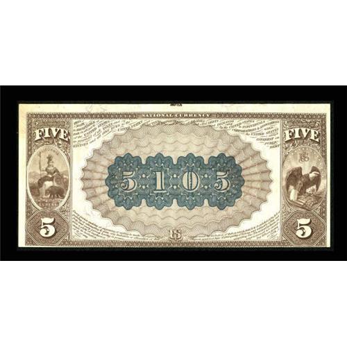 <B>San Francisco, CA</B></I> - $5 1882 Brown Back Fr. 477 <B>Wells-Fargo Nevada NB</B></I> Ch. # (P)5105<BR> The third note of the trio, and a superlative serial number 1 example from the extraordinary denomination set of California Brown Backs which we are privileged to offer in this sale. It is the perfect mate (and in the same grade as well) to the serial number 1 $10 Brown Back from this bank's predecessor institution, the Nevada NB, which realized $34,500 in spirited bidding when it was auctioned earlier this year. This piece, the "A" position $5 example, is truly the "first" note to bear this title, and is the only serial number 1 specimen of any type or denomination known carrying this nomenclature. While the phrase is trite, it is one of the few notes in this or any other sale deserving of the title "museum piece." <B>About Uncirculated,</B></I> certainly one of the most significant California rarities we have ever had the pleasure of offering. <BR><BR><b>Shipping:</b> Coins & Currency (<a target="_blank" href="http://www.heritageauctions.com/common/shipping.php">view shipping information</a>)