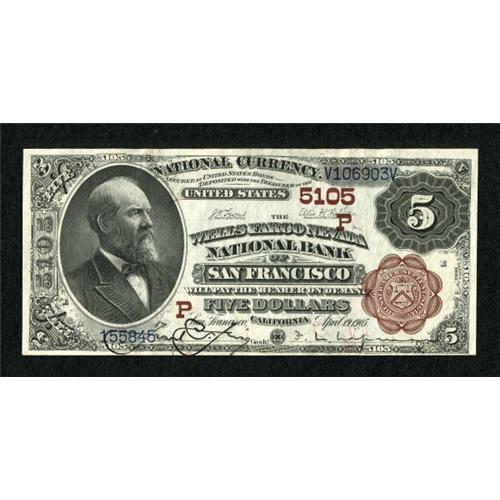 <B>San Francisco, CA</B></I> - $5 1882 Brown Back Fr. 477 <B>Wells-Fargo Nevada NB</B></I> Ch. # (P)5105<BR> An attractive $5 Brown Back which is considerably higher grade than most examples seen from here. Bright <B>Extremely Fine, </B></I>a lovely example from a bank whose title is redolent of the "old west." <BR><BR><b>Shipping:</b> Coins & Currency (<a target="_blank" href="http://www.heritageauctions.com/common/shipping.php">view shipping information</a>)
