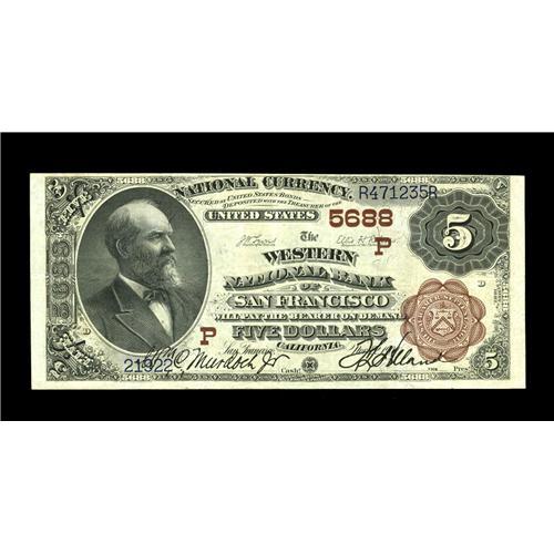 <B>San Francisco, CA</B></I> - $5 1882 Brown Back Fr. 477 <B>The Western NB</B></I> Ch. # (P)5688<BR>A brightly appealing <B>Extremely Fine</B></I> $5 Brown Back from a tougher San Francisco Banking house which issued Date Backs and Brown Backs only before liquidating in 1910. Scarce and attractive enough to be worth at least...