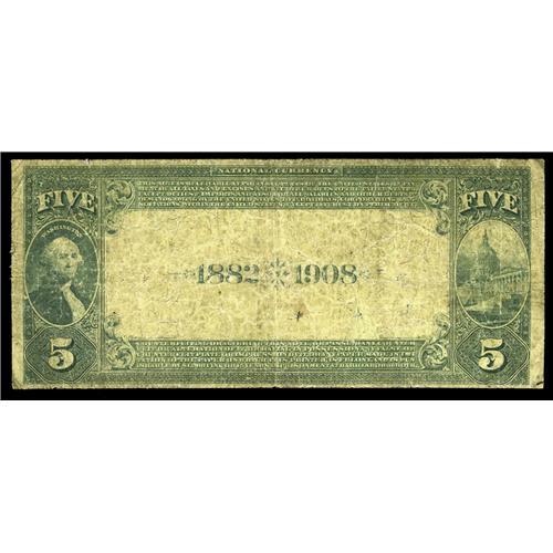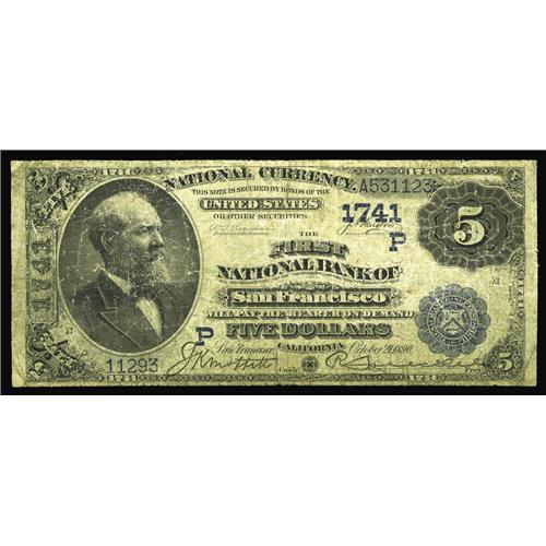 <B>San Francisco, CA</B></I> - $5 1882 Date Back Fr. 532 <B>First National Bank</B></I> Ch. # (P)1741<BR>Here is a worn, but fully intact Second Charter example that has retained a bit of snap. This note is also one of a mere ten 1882 Date Backs in the census for this bank. <B>Very Good.</B></I>