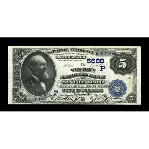 <B>San Francisco, CA</B></I> - $5 1882 Date Back Fr. 537 <B>The Western NB</B></I> Ch. # (P)5688<BR>A nice example for type from a bank which issued Second Charter notes only. <B>Choice Crisp Uncirculated,</B></I> with good color and signatures.<BR><I>From The Bill and Kathy Stella Currency Collection</B></I><BR><BR><b>Shipping:</b> Coin/Currency (<a target="_blank" href="http://www.heritageauctions.com/common/shipping.php">view shipping information</a>)