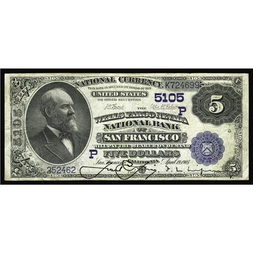 <B>San Francisco, CA</B></I> - $5 1882 Date Back Fr. 537 <B>Wells-Fargo Nevada NB</B></I> Ch. # (P)5105<BR>A hand-picked <B>Fine</B></I> by our consignor.