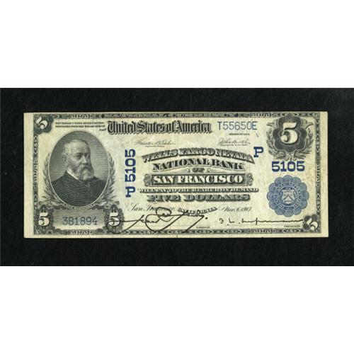 <B>San Francisco, CA</B></I> <B>- </B></I>$5 1902 Plain Back Fr. 606<B> Wells-Fargo Nevada NB </B></I>Ch. # (P)5105<BR> An attractive circulated example bearing this much collected title. <B>Fine-Very Fine</B></I>.<BR><I>From The Rolling Plains Collection</B></I><BR><BR><b>Shipping:</b> Coins & Currency (<a target="_blank" href="http://www.heritageauctions.com/common/shipping.php">view shipping information</a>)
