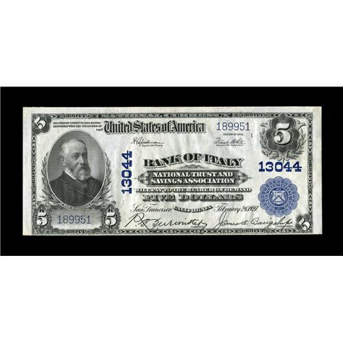 <B>San Francisco, CA</B></I> - $5 1902 Plain Back Fr. 609 <B>Bank of Italy National Trust & Savings Assoc</B></I> Ch. # 13044<BR>A crackling fresh and original <B>Choice Crisp Uncirculated</B></I> note with a sought after title in large. With a bit more bottom margin we'd have classified this lovely note as a full Gem without any hesitation whatsoever. While this is by no means a scarce bank, in this state of preservation it is a considerable challenge to locate and will likely sell to a condition conscious buyer for no less than...<BR><I>From The Bill and Kathy Stella Currency Collection</B></I><BR><BR><b>Shipping:</b> Coin/Currency (<a target="_blank" href="http://www.heritageauctions.com/common/shipping.php">view shipping information</a>)