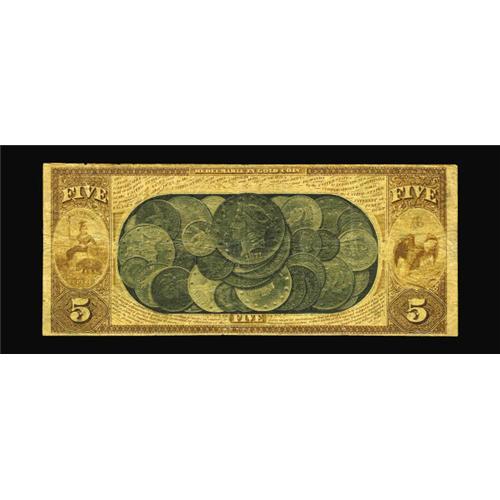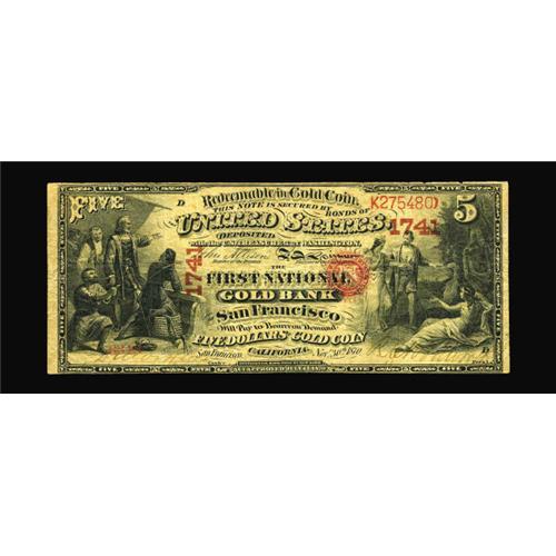 <B>San Francisco, CA</B></I> - $5 Original Fr. 1136 <B>The First National Gold Bank</B></I> Ch. # 1741<BR>This piece is new to the census, and compares very favorably with many of the higher grade examples we sold in the O'Neal National Gold Bank Note collection earlier this year. It displays very bright colors, a vivid coin vignette, strong signatures, and, most important, is utterly original and unmolested. There is a miniscule nick at the top border, but the margins are otherwise perfect. <B>Very Fine,</B></I> an attractive example that is certain to please.
