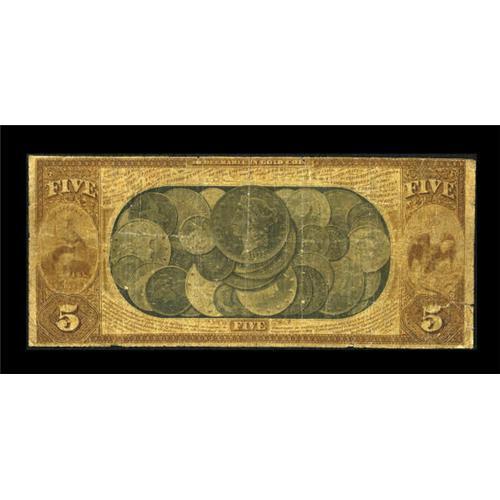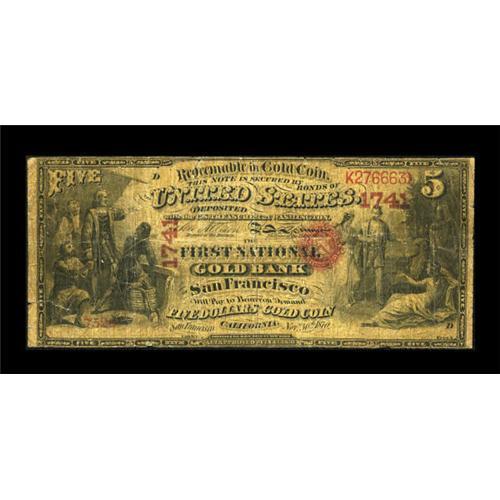 <B>San Francisco, CA</B></I> - $5 Original National Gold Bank Note Fr. 1136 <B>The First National Gold Bank</B></I> Ch. # 1741<BR> A well circulated but still quite collectible specimen with a few splits and one longer tear. The colors are strong for a note in this grade, and the all important coin vignette on the reverse is quite clear. <B>Very Good.</B></I><BR><BR><b>Shipping:</b> Coins & Currency (<a target="_blank" href="http://www.heritageauctions.com/common/shipping.php">view shipping information</a>)