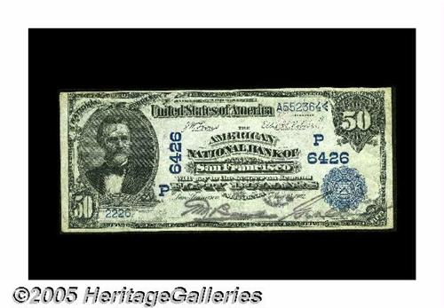 <B>San Francisco, CA</B></I> - $50 1902 Date Back Fr. 667 <B>The American NB</B></I> Ch. # (P)6426<BR>A nice high grade high denomination example with good color and a pleasing appearance. <B>Very Fine.</B></I>