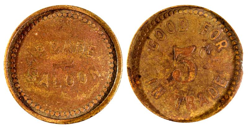 Obverse: Arcade/ Saloon. reverse: Good For / 5c / In Trade. San Francisco saloon at the time of the earthquake and fire.