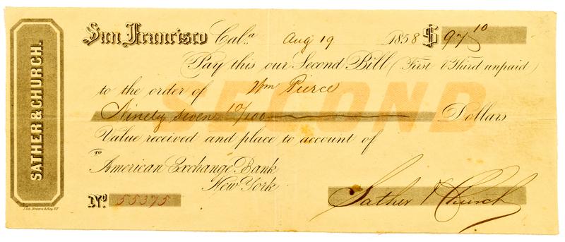 San Francisco,CA - Aug. 19, 1858 - Sather & Church Second of Exchange :