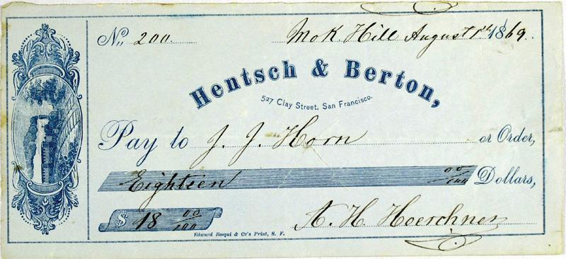 San Francisco,CA - August 1, 1869 - Hentsch & Berton Check :