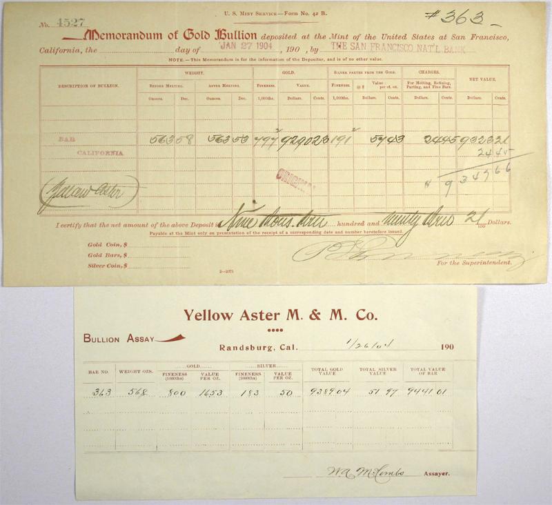 This is a two item lot consisting of a Memorandum of Gold Bullion at the United States Mint of San Francisco and its assay receipt from the Yellow Aster M&M Co. near Ransburg, CA located in the Rand Mining District of Kern County. The assay report from the Yellow Aster M&M Co records the gold bar as being worth $9441.01. It is dated January 26, 1904. The assay categories on the report include the following: fineness, weight in ounces, value per ounces for gold and silver, total values of gold, silver and combined. The accompanying gold bullion memorandum from the US Mint in San Francisco states that the gold bar’s value is $9347.66. The memorandum is numbered 4527, and dated January 27, 1904. An “official” stamp is in the middle of the “gold” column of the memorandum. Ore Deposits were discovered shortly after placer mines had opened in the Rand Mining District in 1893. The Yellow Aster Mine operated from 1893-1918 and then for a brief twenty-year stint from 1921-1941. In its lifetime, Yellow Aster yielded more than 12 million dollars. According to writing and historian R.C. Bailey Yellow Aster was named after a paperback novel from the time period. Yellow Aster Mines was heavily financed by Dr. Rose Burcham. Burcham was one of the first female settlers to arrive in the Randsburg area and was well known as being on of the largest Financiers of her era. According to Dr. Lorraine Blair, Dr. Rose Burcham, “provided the grubstake that got the great Yellow Aster Mine and Mill established, and then grew into her role as ‘Boss Lady of the Yellow Aster Mine’.”