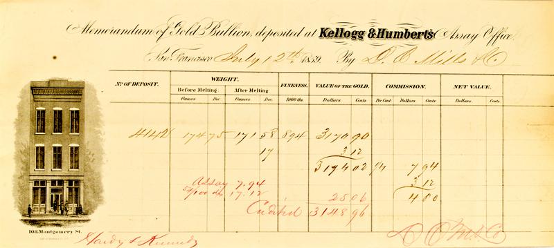 Memorandum of Gold Bullion deposited by D.O. Mills & Co. This receipt and the next two offered are all the same size and design, (measuring 10 ½ x 5” and printed in black ink on buff colored paper. Each of these receipts has a wonderful detailed vignette of the Kellogg & Humbert office building, 108 Montgomery St., pictured on the left. Lithography: Britton & Co S.F. Weight before melting 174.75oz, after melting 1171.58oz, Fineness .894, Net value $3148.96. There is a small ¾ tear on the right hand side along a fold and some typical foxing. There are two types of Kellogg & Humbert’s receipts, 1) a plain form and 2) with a vignette in the left margin of their assay office located at 108 Montgomery St in San Francisco. This receipt falls in to the first category: no vignette with columns and rows for bullion data entry. Most of the Kellogg & Humbert receipts survive today because of the Hardy & Kennedy archive. There are about 100 Kellogg & Humbert receipts known in existence which include both varieties of those with and without vignette. Fine to Very Fine