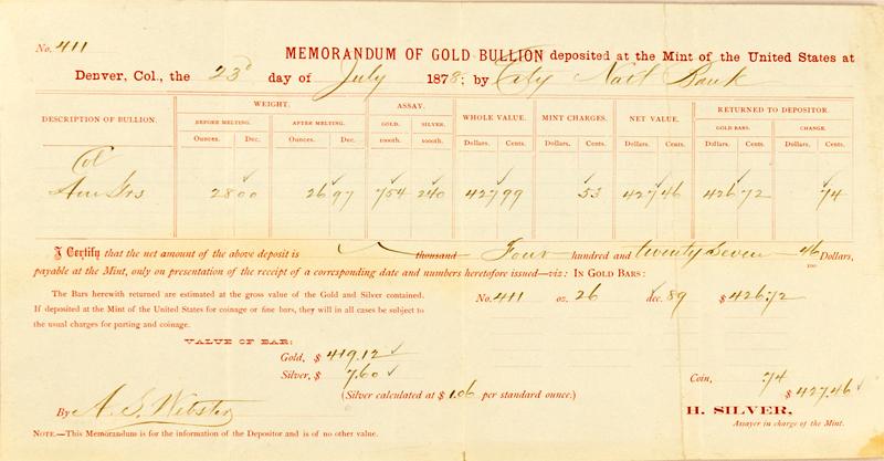 San Francisco,CA - July 23, 1878 - Mint of the United States Memorandum of Gold Bullion Deposit :