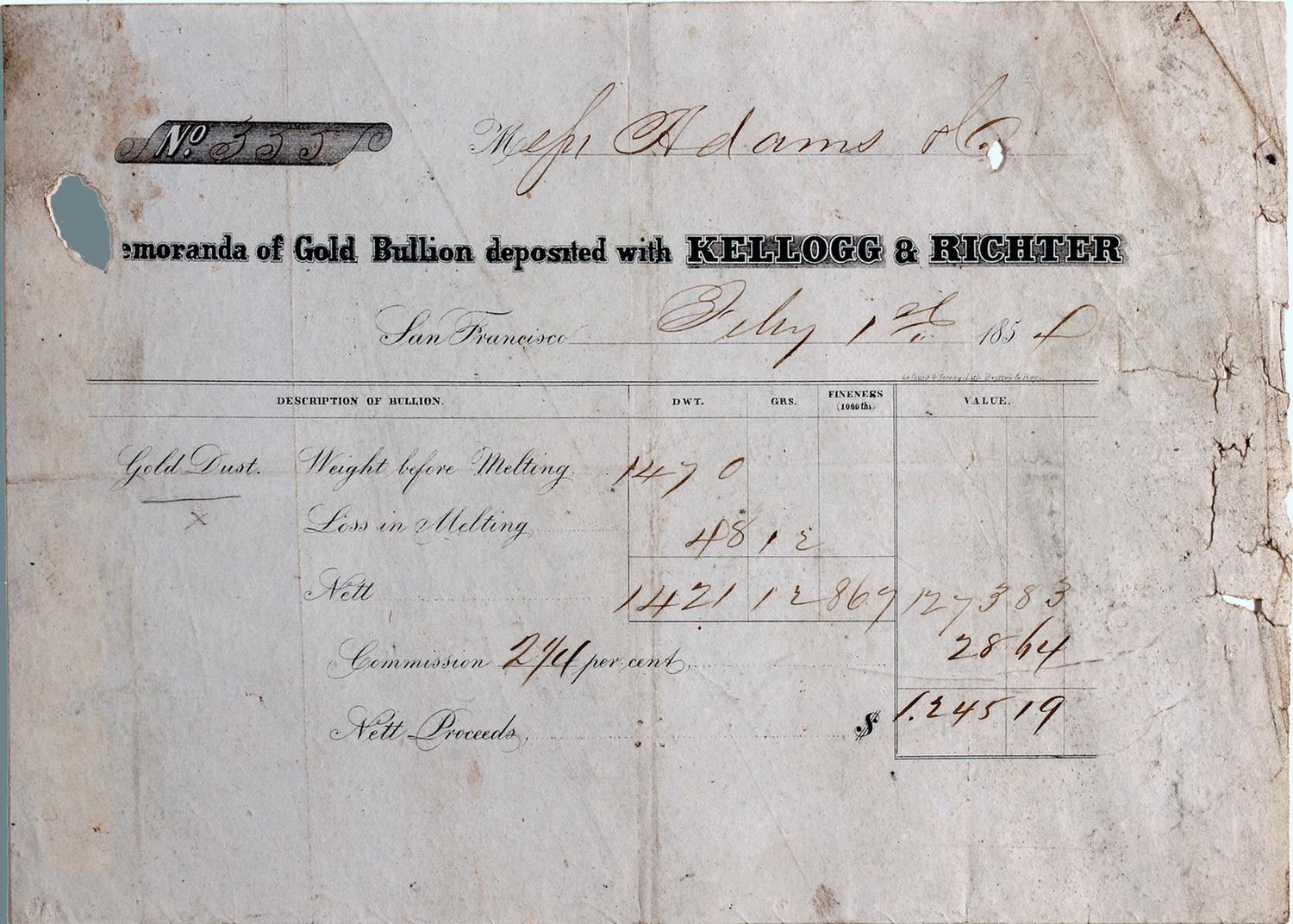 Kellogg & Richter assay documents are among the most desirable. They were in business from 1853-1854 and had an Assay Office in San Francisco. Kellogg & Richter are perhaps known best for their California gold coinage.