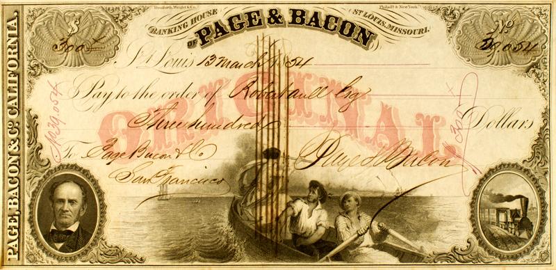 No. 39.054, first of exchange payable to Robert Aull, Esq. $300.00. Signed by Page & Bacon, this is a rare Page & Bacon piece. At left is “Page, Bacon & Company, California” and at top is “Banking House of Page, Bacon, St. Louis, MO'. Printed by Danforth, Wright & Co. Philadelphia & New York. At lower left is a vignette of Page, in the center is a wonderful vignette of a lady and two young sailors in a row boat, and at right is a vignette of a train. Six vertical lines through center as cancellation of the endorsement on reverse. Fine condition. Probably R8, maybe R7. We've seen only one or two in thirty years. Extremely Fine.