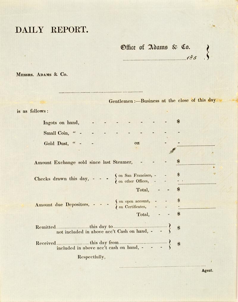 This unused daily report sheet is in immaculate condition. This blue paper document has categories for the following: "Ingots on hand, Small Coin, Gold Dust, Amount Exchange sold since Last Summer, Checks drawn this day, Amount due Depositors, and Remissions." The reverse is dated May 23, 1854. This important sheet shows how the circulating money in California in 1854 were four items: gold ingots, coins, gold dust and exchanges. Two small folds visible on the reverse. 10" x 7 1/2". Very Rare. Excellent Condition.