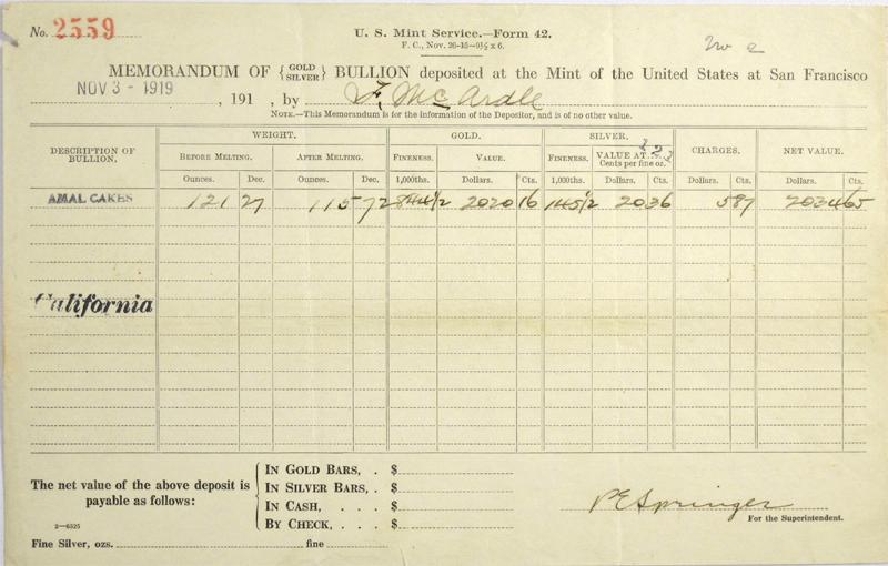 Miner Ferguson McArdle. McArdle submitted this memorandum with his findings classified as amalgam cakes. Amalgam is a mixture between mercury and another metal, in this case gold or silver. When gold extraction was used with amalgam, the ore deposits were usually found in large gray lumps. These amalgam lumps were typically heated at very high temperatures; the gold would separate, and the mercury could be reused. The resulting gold was typically referred to as “flour gold.” This assay memorandum is numbered 2559, and has assay categories for weight before and after melting, the fineness and value for the quantities of gold and silver. It measures 9 ½” x 6”. The mint superintendant PE Springer signed. It is dated November 3, 1919. Overall good condition.