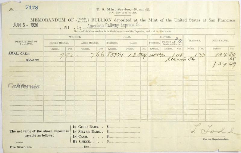 Memorandum of Gold Bullion was submitted to the United States Mint at San Francisco by The American Express Railway Company. A.E.R.C. submitted this memorandum with their findings classified as amalgam cakes. Amalgam is a mixture between mercury and another metal, in this case gold or silver. When gold extraction was used with amalgam, the ore deposits were usually found in large gray lumps. These amalgam lumps were typically heated at very high temperatures; the gold would separate, and the mercury could be reused. The resulting gold was typically referred to as “flour gold.” This assay memorandum is numbered 7178, and has assay categories for weight before and after melting, the fineness and value for the quantities of gold and silver. It measures 9 ½” x 6”. The mint superintendant PE Springer signed. It is dated June 5, 1920. Overall good condition.