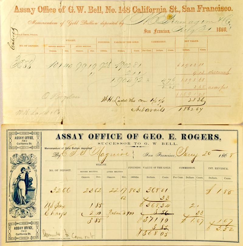 Lot of two: #1: No. 3588 Memorandum of Gold Bullion Deposited by Brumagem & Co., with the following assay results: Weight before melting 101.40 oz, After Melting 99.19 oz, Fineness .928, Value $1,902.81, less discount of $9.13, $2.65 Assay Fees, $28.36 W.H. Ladd & Co. on a Commission of 1 ½ %. Net Value: $1,862.64. W.H. Ladd & Co. was a prominent banking firm located at Downieville in Sierra County, CA. Printers: Towne & Bacon, 10 ½ x 5 ¼,” on crème colored paper with dull red print. This document is lightly soiled and stained and has the usual folds and foxing with some minor tears along bottom edge. From the Bell Collection. #2: No. 3266 Memorandum of Gold Bullion, January 20, 1868; deposited by C.S. Maguire. Bullion tax noted.