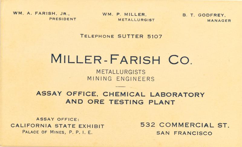 San Francisco,CA - c. 1915 - Miller-Farish Co. Assay Office Business Card :