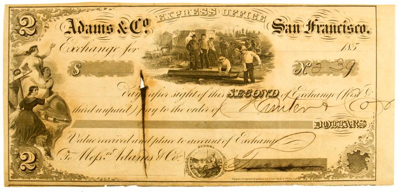 Second of Exchange written from the Adams & Co. Express Office, San Francisco, with no date listed. No. 539, with no amount listed. Payable to Hunter & Co., signed by Freeman & Co., with Freeman lined-out. Hunter & Co. endorsement written on the reverse also lined-out, which appears to have resulted in a tear in the paper. Appears to be a voided document, never completely filled out. Vignettes include miners with sluice box at top center, three allegorical women at center left, and the Seal of California at bottom center. The seal was designed by Major R. S. Garnett of the U.S. Army and adopted at the Constitutional Convention of 1849, prior to California becoming a state in June, 1850 (netstate.com/states/symb/seals/ca). Printers: Toppan, Carpenter, Casilear & Co., New York & Philadelphia. Freeman & Co. was a Northern California based express office used initially by Adams & Co. for its routes outside of the San Francisco-Stockton-Sacramento corridors which Adams operated itself. Adams & Co. later absorbed Freeman & Co [Bancroft, Vol. VII, p. 150 ]. C.E. Hunter & Co. was a general merchandise operation located along Jackson St. in San Francisco [Bancroft, Vol. VI, p. 175]. Printed on white paper, very good condition. Type II, Variety IIA.