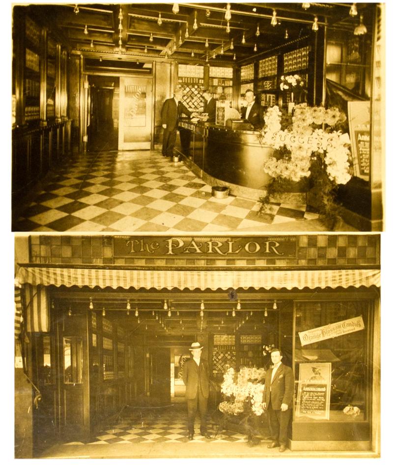 Lot of two beautifully mounted photographs of The Parlor. The interior shot is labeled "No. 11 S. First St." and the exterior shot is labeled "Our Other Store". An announcement clearly reads that the Jack and Morris Hill business is changing hands to Hill, Kehl, and Widby. The exterior photograph advertises a shipment of Orange Blossom Candies with a sign in the window. Both photographs show a floral decoration in the shape of a swastika clearly displayed. Across the swastika is the word "success". The swastika was used by many cultures throughout the past 3,000 years to represent life, sun, power, strength, and good luck long before it became associated with the Nazi party. In the early twentieth century, the swastika remained a symbol with positive connotations and was a common decoration used to adorn cigarette cases, postcards, coins, and buildings. It is interesting to note, however, that early anti-semetic German political parties raised money by selling a tobacco called "Anti-Semit", an ironic turn as Hitler later headed up an anti-smoking campaign. We choose to believe the floral displays pictured here are intended as a symbol of good luck for the opening of these establishments. Both photographs measure approximately 4 1/2" X 6 1/2" and are mounted on 7" X 9" black cardstock. Good condition and contrast.