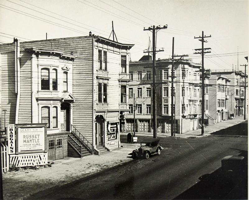 This 9 3/4" by 7 3/4" glossy unmounted photo by an unknown photographer, shows a street scene of San Francisco in the 1930s. The photo is sharp and has high contrast. There is no information on which street it is. There seems to be a used car lot on the left edge of the photo as there is a sign advertising terms. A single family wooden home is next to the used car lot, complete with underground garage. The wooden building on the corner houses a grocery store on the street level and living quarters above. What is evidenced by this photograph is that city zoning laws were rather eclectic.