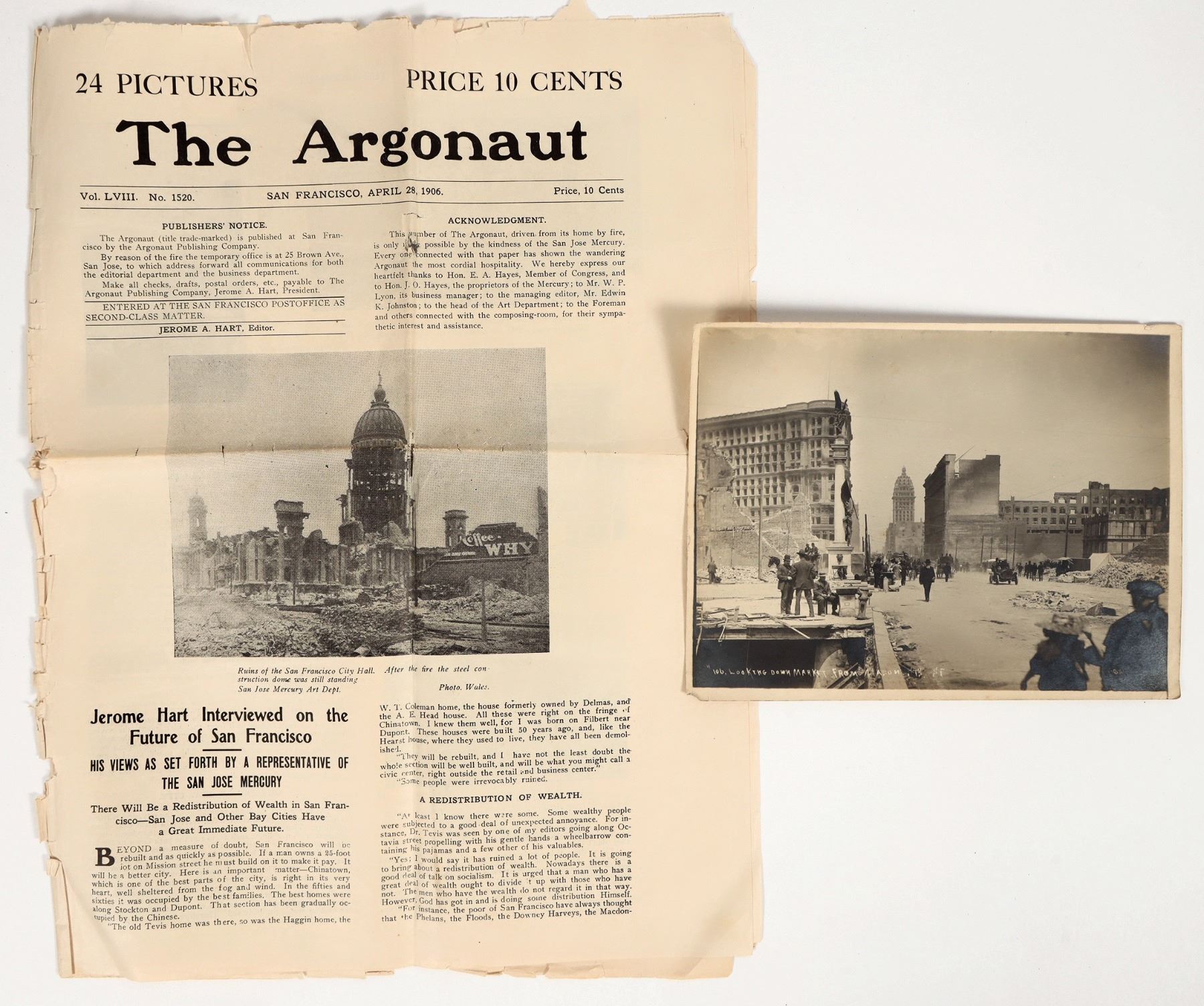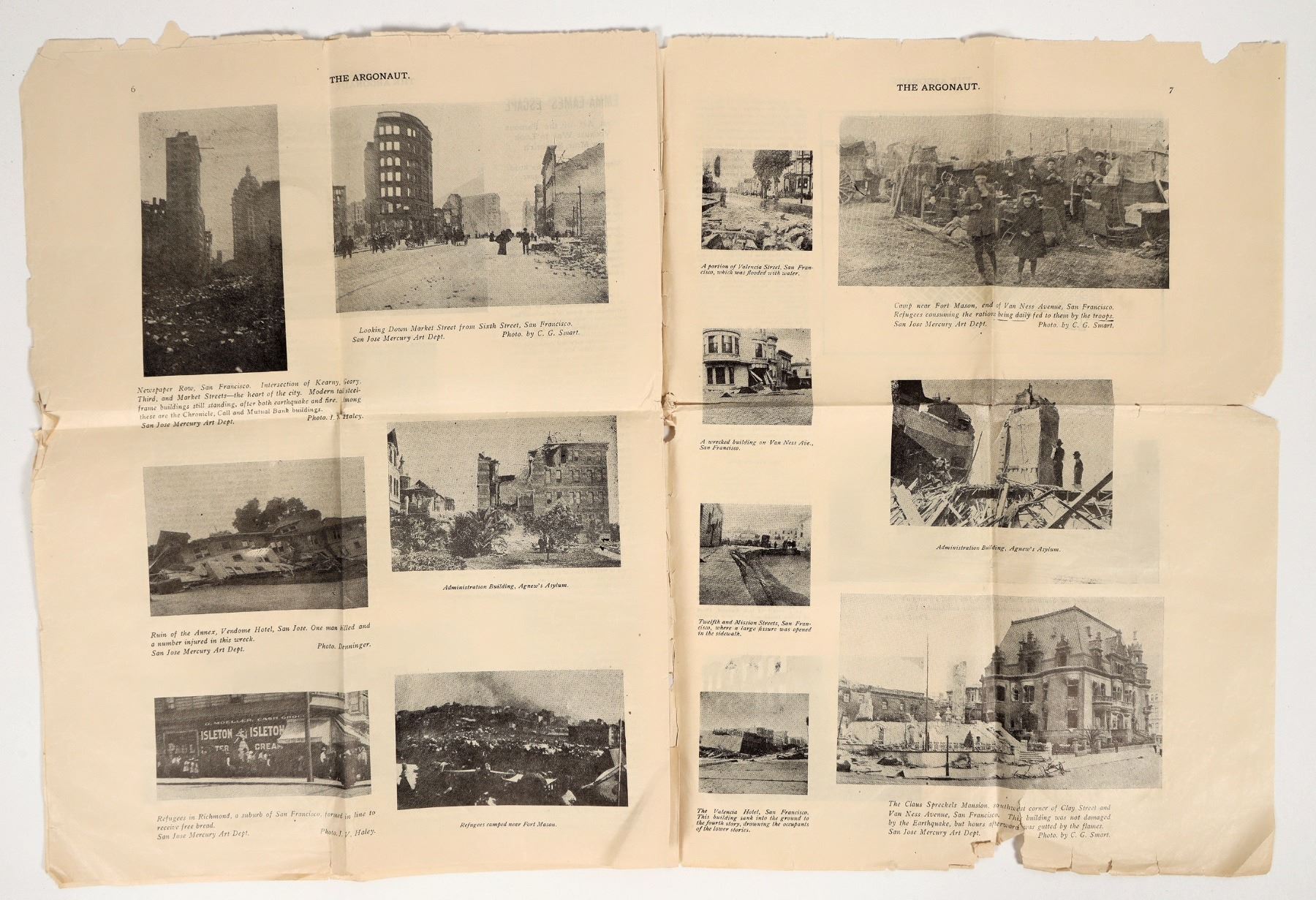Lot of (2) SF Great Earthquake aftermath pieces. First is The Argonaut Newspaper from April 28, 1906, a 10c publication. It has (24) photos and articles illuminating the tragic disaster, with maps depicting the burnt areas, and the lead article on the future of San Francisco. There is a period photo looking down Market Street, showing the severe damage sustained by the various buildings. While this is historic, the graphics showing the sheer damage to the city will be a stark reminder compared to how it looks now. Please review photos.