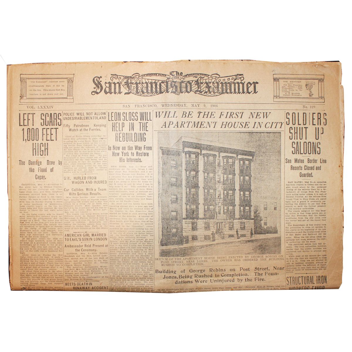 ''San Francisco Examiner'' newspaper dated 9 May 1906, weeks after the giant earthquake that all but destroyed the City by the Bay. Headlines include: ''Will Be The First New Apartment House In City'' and ''Ready to Put in 5,000 Telephones''. Articles include interesting tidbits such as the fact that the tumbler killed valuable, pest-eating bugs. 17'' x 11.5'' folded, 17'' x 23'' unfolded. Section one only runs 16pp. Toning and minor chipping throughout, .25'' hole in upper left not affecting masthead or headlines, overall very good.