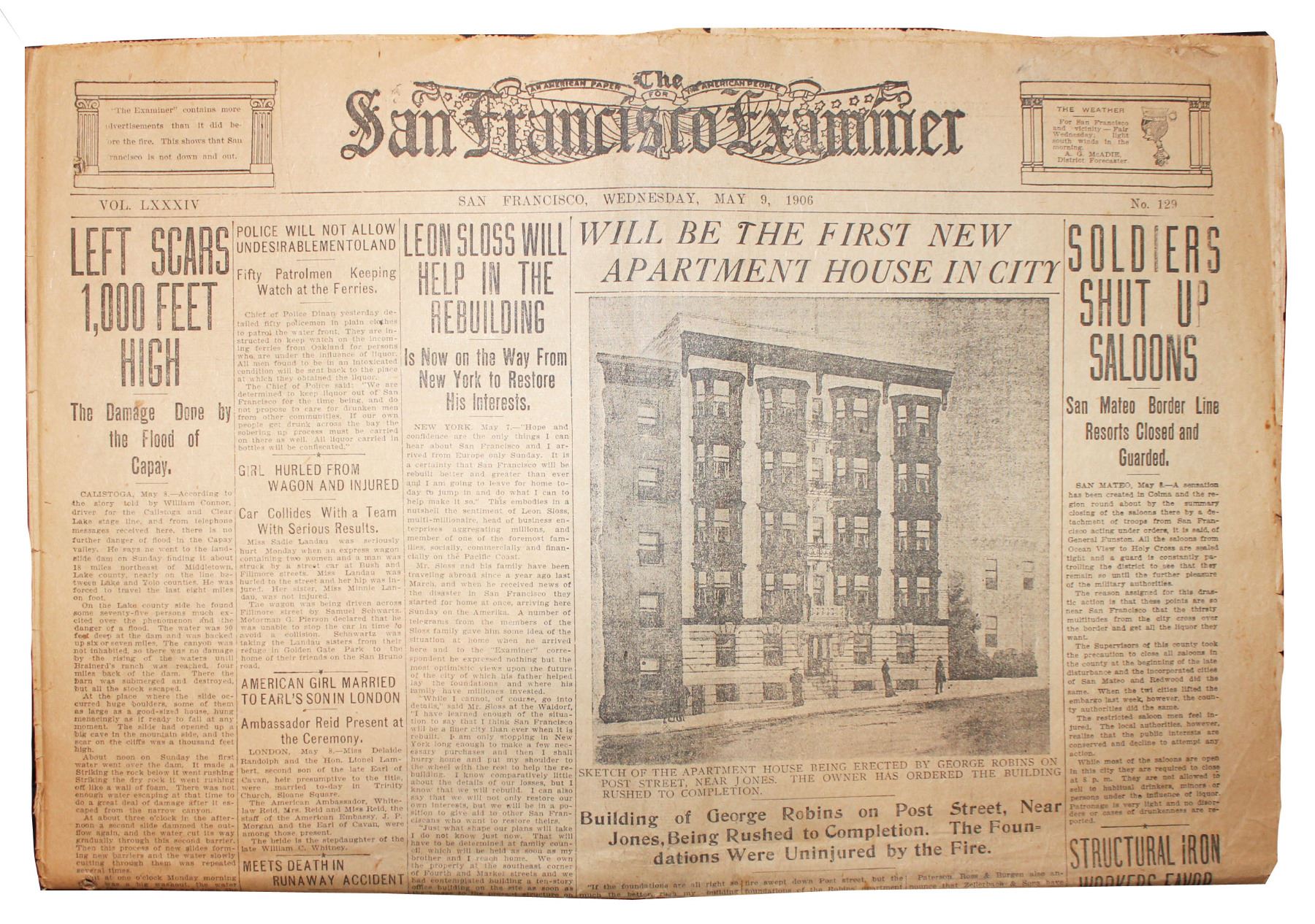 ''San Francisco Examiner'' newspaper dated 9 May 1906, weeks after the giant earthquake that all but destroyed the City by the Bay. Headlines include: ''Will Be The First New Apartment House In City'' and ''Ready to Put in 5,000 Telephones''. Articles include interesting tidbits such as the fact that the tumbler killed valuable, pest-eating bugs. 17'' x 11.5'' folded, 17'' x 23'' unfolded. Section one only, runs 16pp. Toning and minor chipping throughout, .25'' hole in upper left not affecting masthead or headlines, overall very good.
