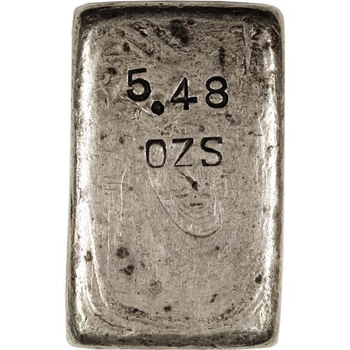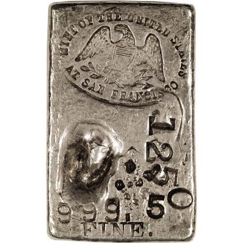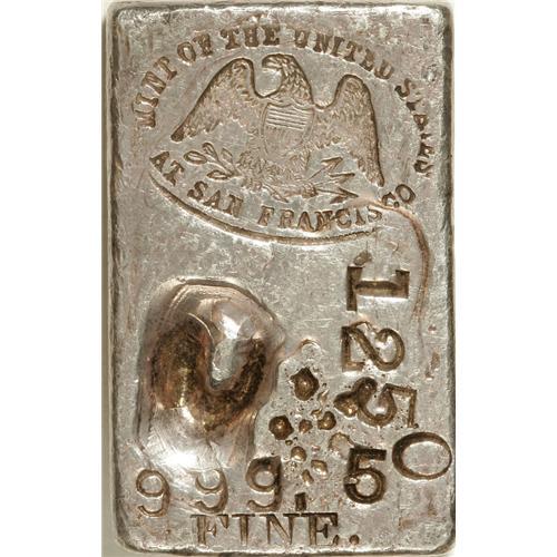 <B>San Francisco Mint Silver Ingot.</B></I> A rather crudely made mint ingot. Apparently quality control for silver ingots was not as strict as it was for silver coinage. The upper part of the top side has the oval stamp of the mint. The lower left part is a gas bubble that has left a large depression. Next to it is the ingot number: 1250, but it is set on its side. At the bottom is 999./FINE. The weight is stamped on the upper part of the back side: 5.48/OZS. The silver-gray surfaces show darker toning within the recesses.<BR><BR><b>Shipping:</b> Coins & Currency (<a target="_blank" href="http://www.heritageauctions.com/common/shipping.php">view shipping information</a>)