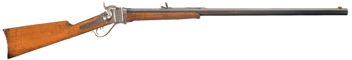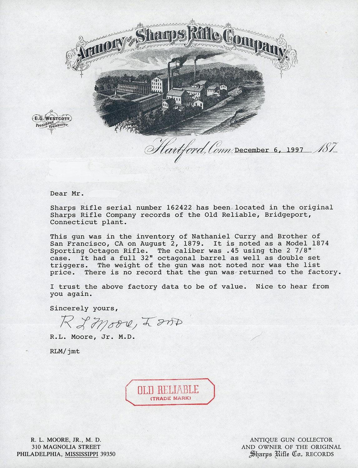 This Bridgeport manufactured Model 1874 was made circa 1871 to 1881 (the Model 1874 was not applied to the gun for a few years after production began). Under the remarkable period custom rear buck horn sight, the top of the barrel is marked "SHARPS RIFLE CO. BRIDGEPORT, CONN.", writer can not see the Old Reliable marking. Writer assumes that the marking is there due to the fact this rifle was manufactured after 1876 and is Bridgeport marked. The left rear barrel flat is marked "CAL 45 2 7/8". The left side of the frame is marked "SHARPS RIFLE CO / PAT APR 6 1869". The serial number is marked horizontally along the back of the receiver. The number is correctly marked with 6 numbers because the "C" prefix was dropped after serial number C54800. The front sight is a replacement ivory blade and the rear sight is a replacement adjustable large semi-buck horn type. The barrel is numbered to the gun. The rifle is equipped with double set triggers and mounted with a smooth forearm and straight grip stock with an iron buttplate. The rifle is accompanied by a factory letter which verifies the serial number, caliber using a 2 7/8" case, double set triggers, full 32 inch octagon barrel and that it was in the inventory of Nathaniel Curry and Brother of San Francisco, Ca. on August 2, 1879.
