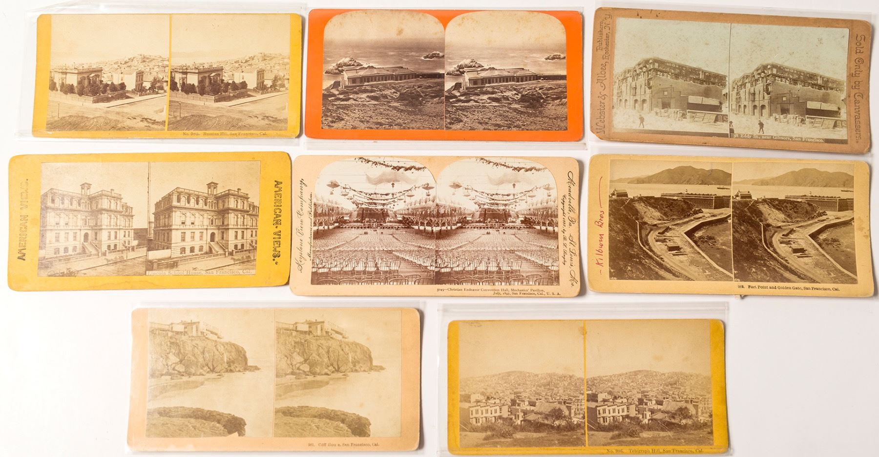 Lot of 8 different nice early San Francisco (and area) stereoviews. 1) Four by Kilburn Bros.: Russian Hill bird's-eye view; Telegraph Hill bird's-eye view; Fort Point & Golden Gate; and Cliff House. 2) One by Webster & Albee (New York) of Eddy Street. 3) One c.1897 Keystone view of the interior to the Christian Endeavor Convention Hall, Mechanic's Pavilion. 4) Two unidentified photographers: Cliff House (possible Taber or Watkins); and one of Lincoln School House. Please inspect. (Prag Collection) Date: Location: San Francisco, California HWAC # 54740