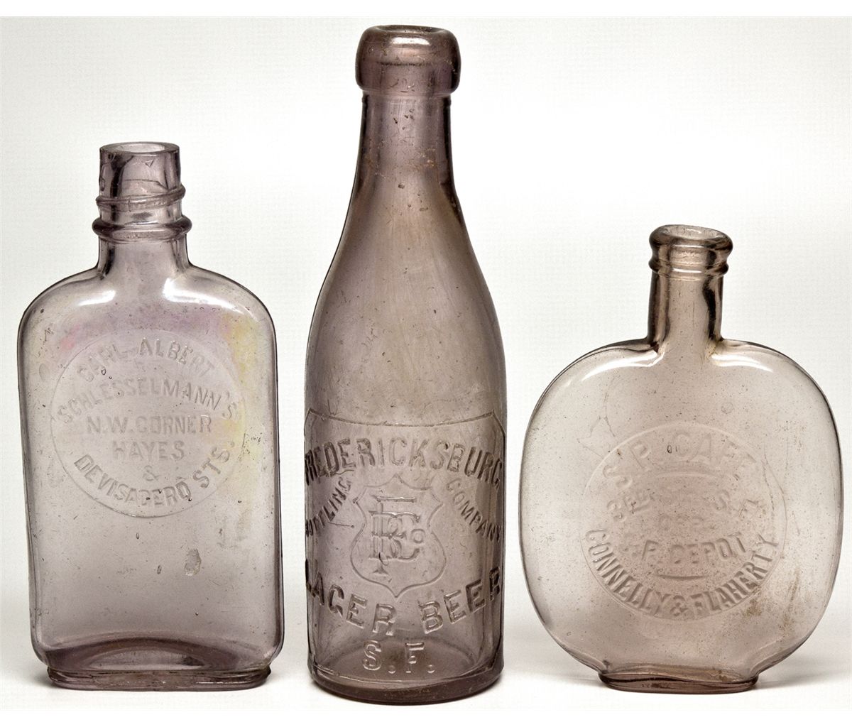 Lot of 3. 1) Beer bottle from Fredericksburg Bottling Company Lancer Beer (1899-1911), located at 1510-1512 Ellis Street. The bottle has stains with purple tint from sun exposure. Air vents throughout and chip on the bottom. 2) S.P. Café 3rd St. SF S.P. Depot Connelly and Flaherty picnic (1907-1912). Half pint, clear glass with some minor stains and purple sun tinting. According to Thomas, there is only one 1-pint and one half-pint known. Bottom embossed “377 X.” 3) Carl Albert Schlesselmann’s NW Corner Hayes & Devisadero Sts. Note (1907), Divisadero is misspelled on the bottle. Outside screw top, round base and clear glass with purple tint. Chips on the bottom along with small air vents throughout [Ref: Picnics, Coffins and Shoo-Flies, John Thomas, 1974]. - Feisel Collection -59100