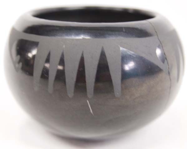 San Ildefonso Black-on-Black Pot by Pauline. Burnished black-on-black pot signed ''Pauline''. Measures 2.5'' x 4''.